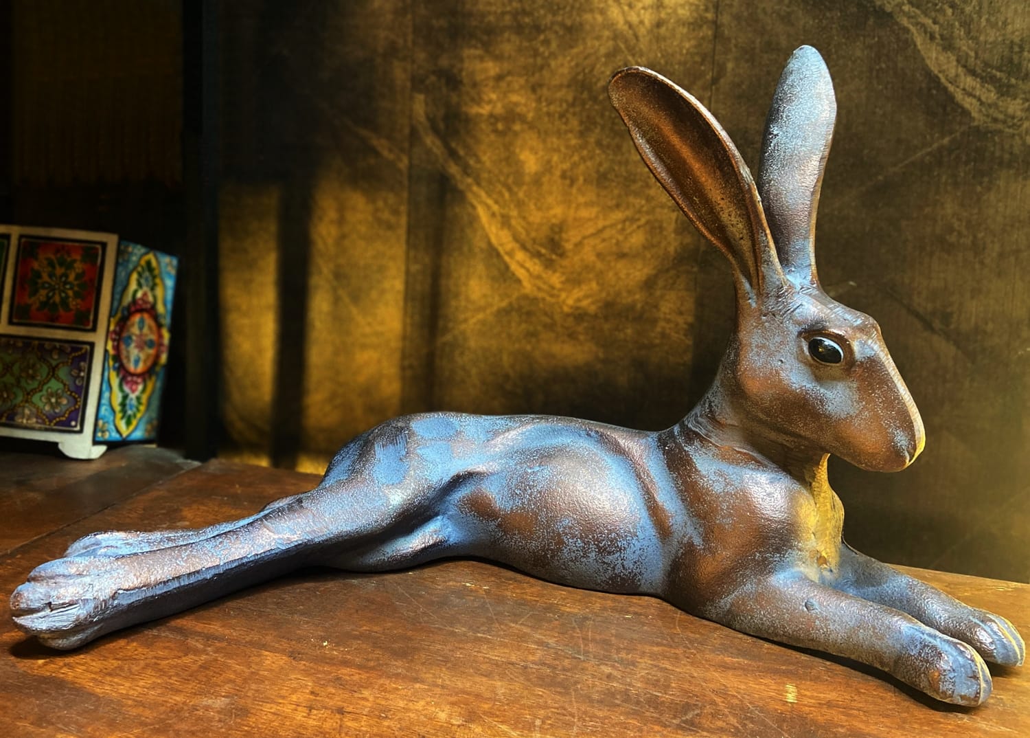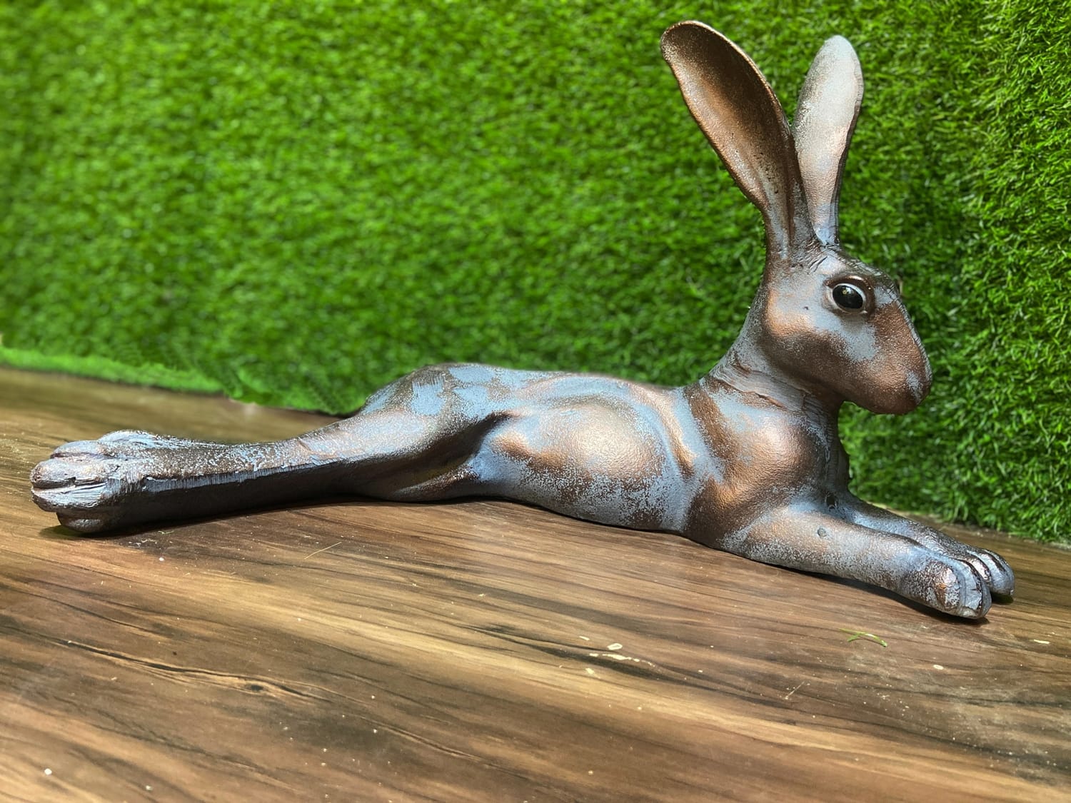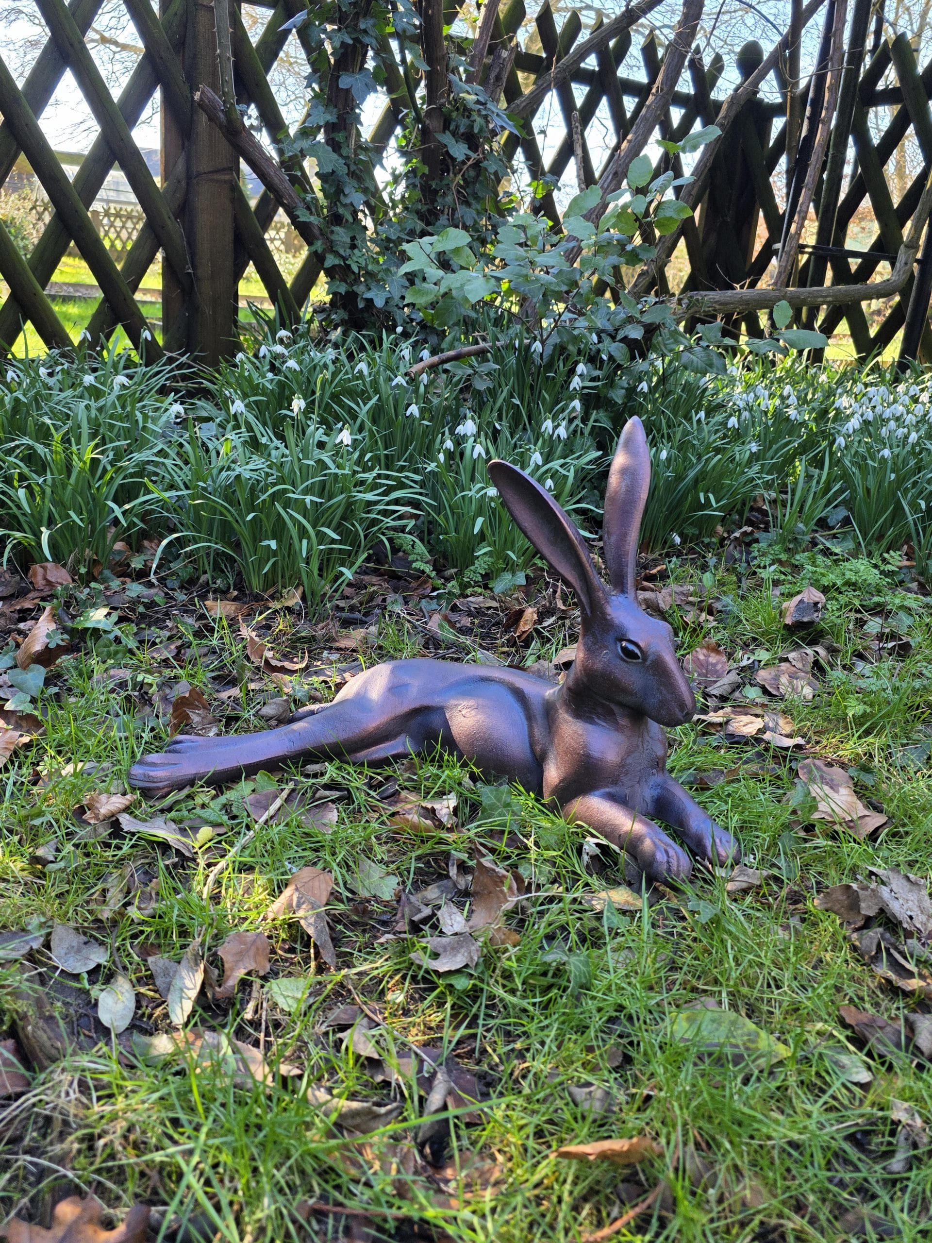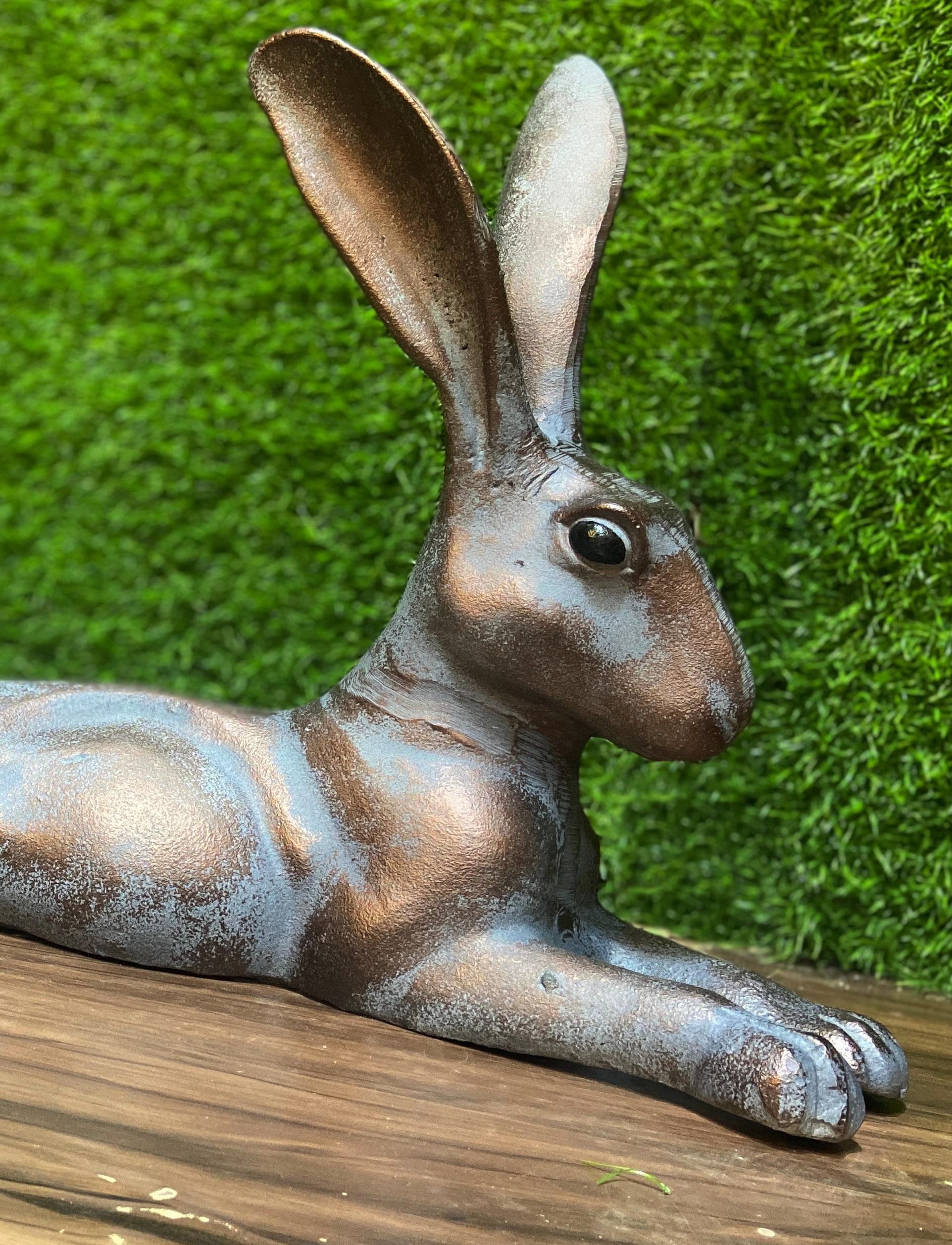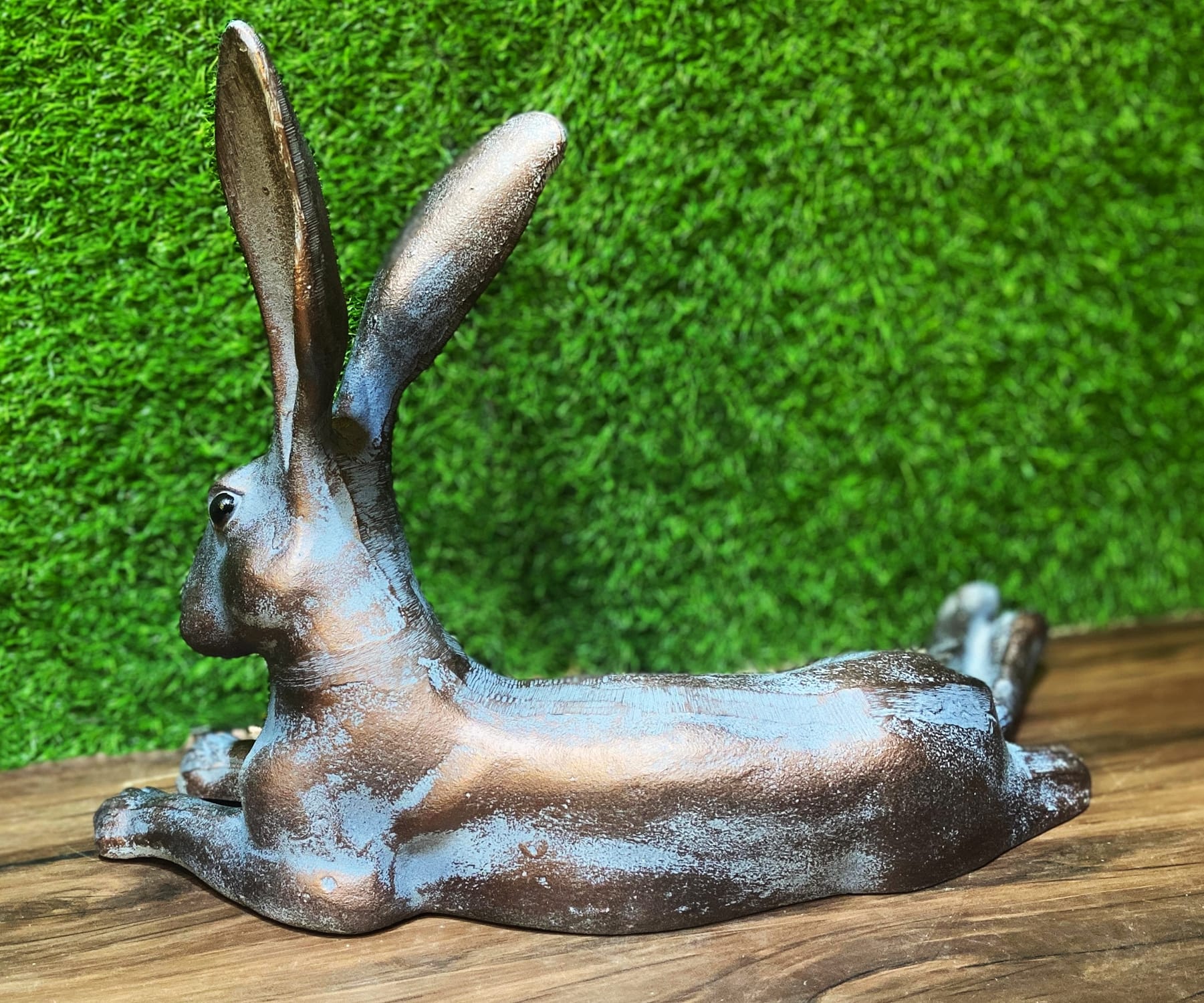 - Delightful Laying Hare garden sculpture made from solid cast aluminium with a hand finished aged bronze