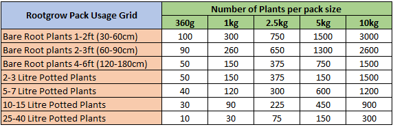 Rootgrow Mycorrhizal Fungi – we recommend it be used for all bare root plants. We sell the special gel pack fertiliser so that you can easily mix up your rootgrow and dip in the roots before planting. We do pack sizes from 360g up to 10kg tubs. Take a glance at our usage grid to see which one you need!